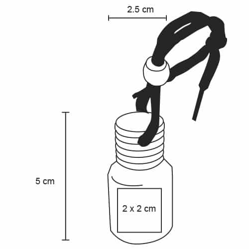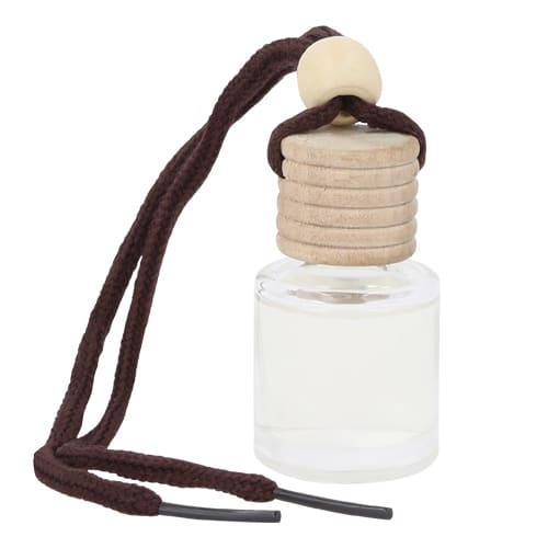 - Descripción: Aromatizante para auto con envase de vidrio, tapa de madera y sujedator de cordón.