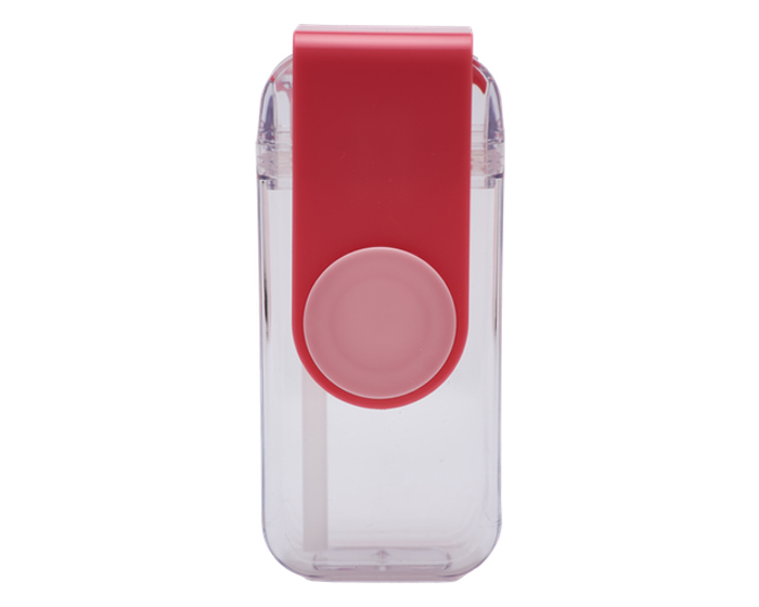 Cilindro de plástico transparente con diseño en forma de “cajita para jugo”. Cuenta con asa giratoria en color pastel, la cual al deslizarse hacia un lado permite que se expulse el popote. Al regresar el asa a la posición vertical, el popote vuelve a colocarse en su lugar. El popote es de silicón, no tóxico. La tapa sella a presión y cuenta con seguro para líquidos. CAP. 280 ml. Presentación: caja en color blanco.