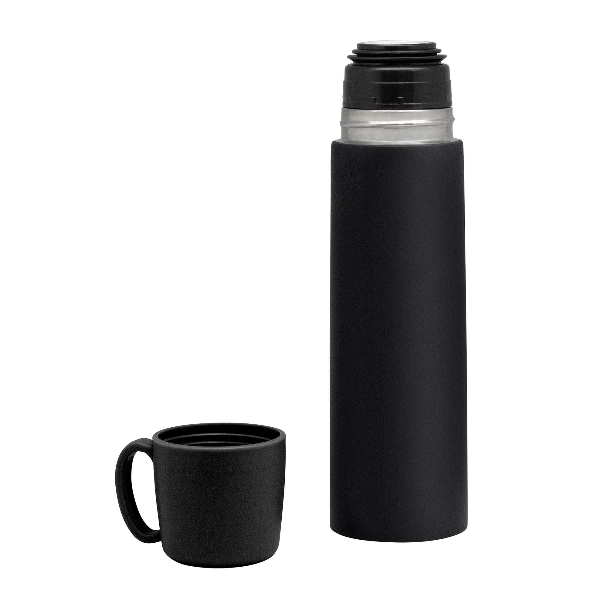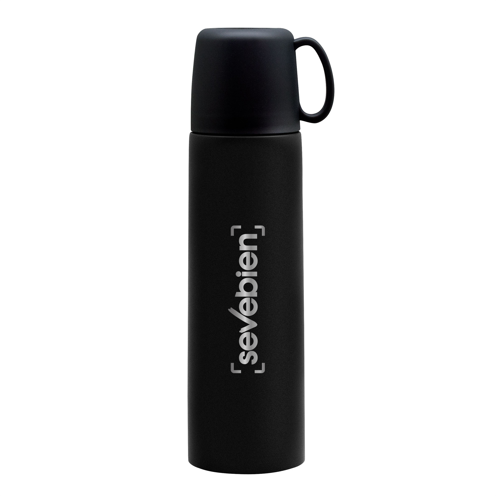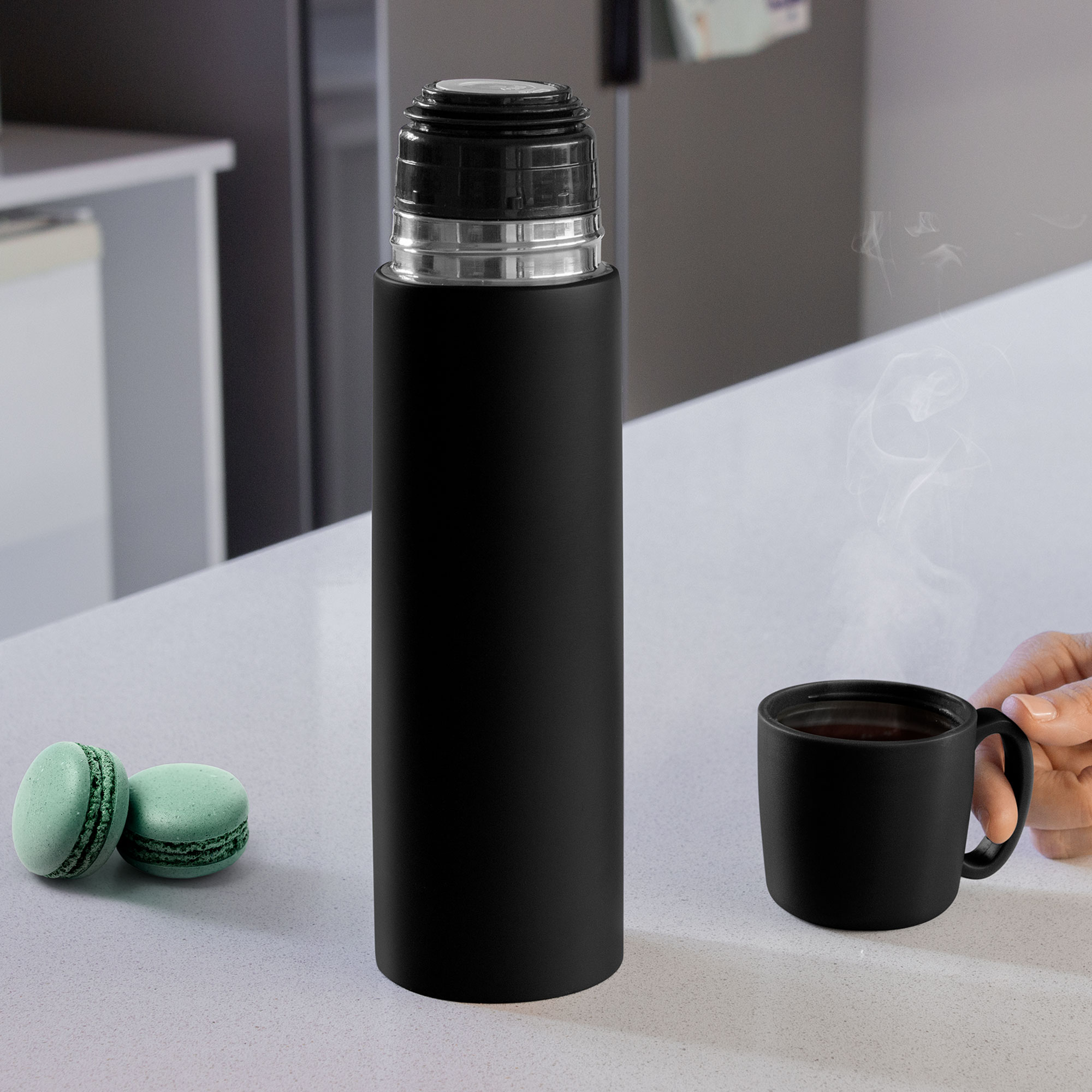 8,1 x 6,8 x 25 cm. Capacidad 500 ml. Acero inoxidable y Polipropileno. Termo con doble pared sellado al vacío. Acero inoxidable 304 interior / 201 exterior. Tapa y taza plásticas en color negro. Pintura acabado mate. Mantiene hasta 12 hs la temperatura de las bebidas calientes y 24 hs de las bebidas frías. Presentación en caja de regalo Kraft.