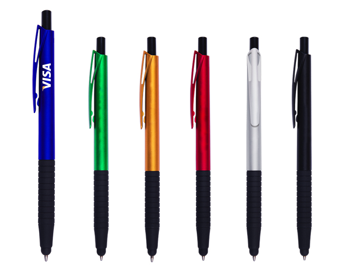 | 🏷️Descripción del producto | Bolígrafo de plástico en colores metálicos, punta touch y goma antideslizante. Mecanismo de click. |