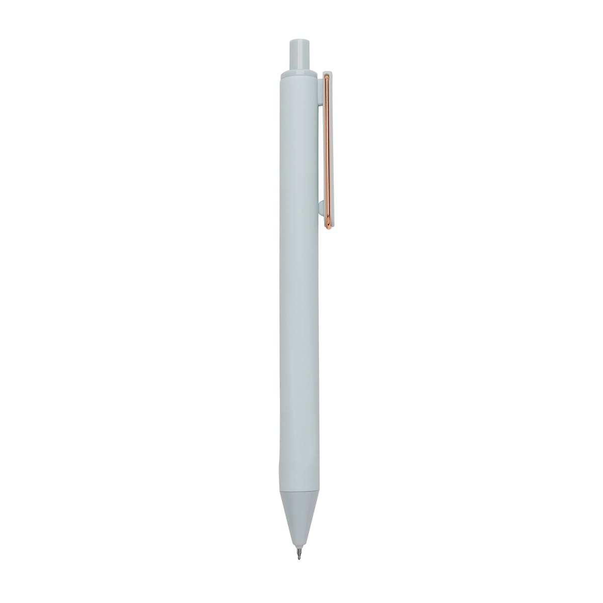 Boligrafo con terminado tipo rubber. Mecanismo pulsador. Su diseno inferior permite un mejor agarre.