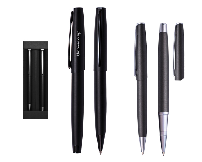 | 🏷️Descripción del producto | Set de bolígrafos metálicos. Un bolígrafo de punto fino tipo roller con tapa y otro bolígrafo con mecanismo retráctil con clip metálico. Presentación: caja en color negro. |