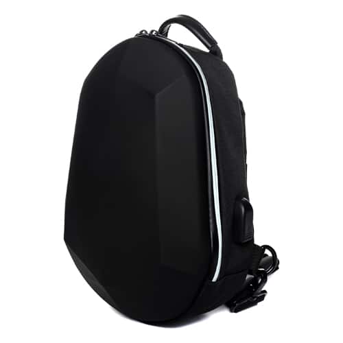 Bolso de hombro de carcasa dura. Contiene 5 compartimentos internos, candado de seguridad, entrada lateral para batería portátil (incluye cable), asa superior y correa ajustable acolchonada con un pequeño compartimento externo.