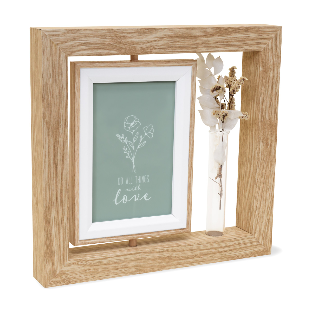 | 🏷️Descripción del producto | Su diseno elegante y atemporal, resaltara la belleza de tus fotos favoritas. Contiene un marco giratorio, con capacidad para fotografias de 10 x 15 cm y un recipiente de vidrio con flores secas. Anade un toque calido y natural a tus espacios. Incluye caja individual. |
