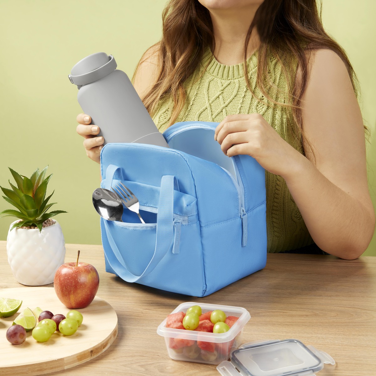 | 🏷️Descripción del producto | Lonchera fabricada en poliester resistente y duradero, cuenta con un forro plastificado que facilita su limpieza. El compartimento principal, tiene un cierre y un bolsillo frontal para llevar objetos pequenos como, cubiertos, snacks o utensilios. Sus dos asas superiores facilitan su traslado y se pueden unir con un practico broche para mayor comodidad. Con una capacidad para 9 latas, esta lonchera es ideal para llevar tus comidas y bebidas favoritas de manera segura y organizada. |