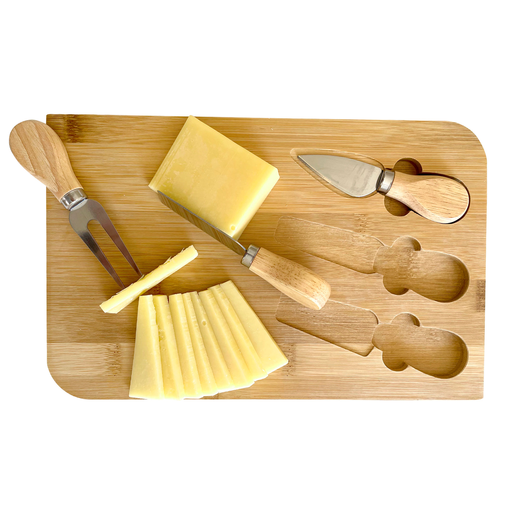 29,8 x 18,7 x 1,2 cm. Bambú y Acero inoxidable . Tabla de bambú con set de 3 utensilios de acero inoxidable 210 con mango de madera: 2 cuchillos y 1 tenedor. Tabla para cortar y presentar diferentes quesos acompañada de un buen vino tinto en tus próximas reuniones. Presentación en caja de regalo.