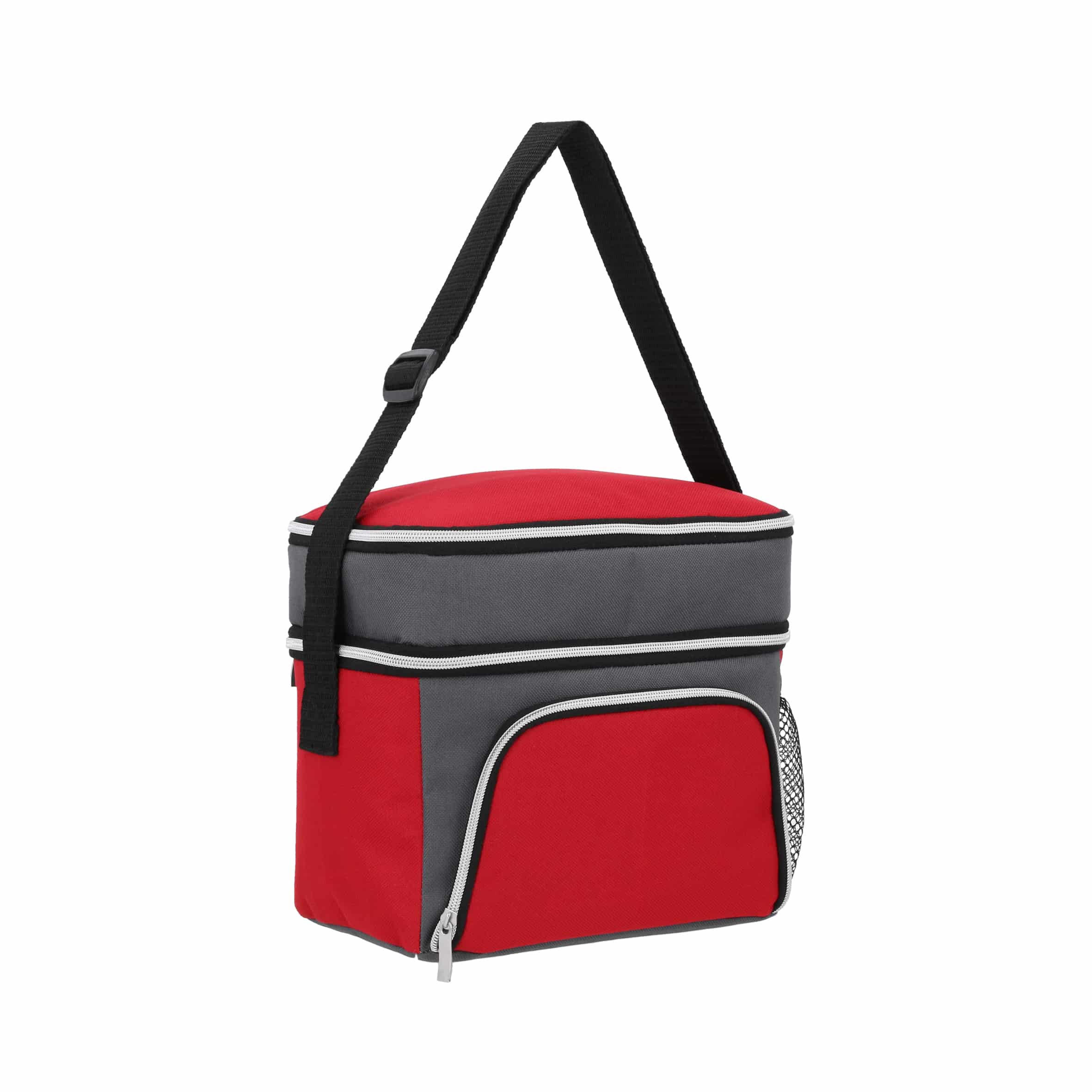 Hielera de 3 compartimentos: 1 compartimento principal plastificado, 1 compartimento en la parte superior, 1 compartimento externo al frente, 1 malla lateral, cierres y correa ajustable.