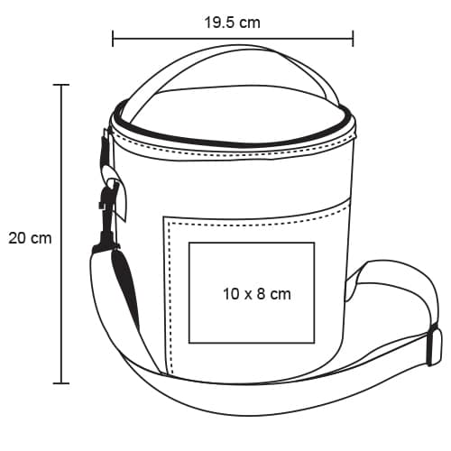 - Descripción: Hielera circular en poliéster con interior reforzado en plástico, correa ajustable y compartimento frontal.