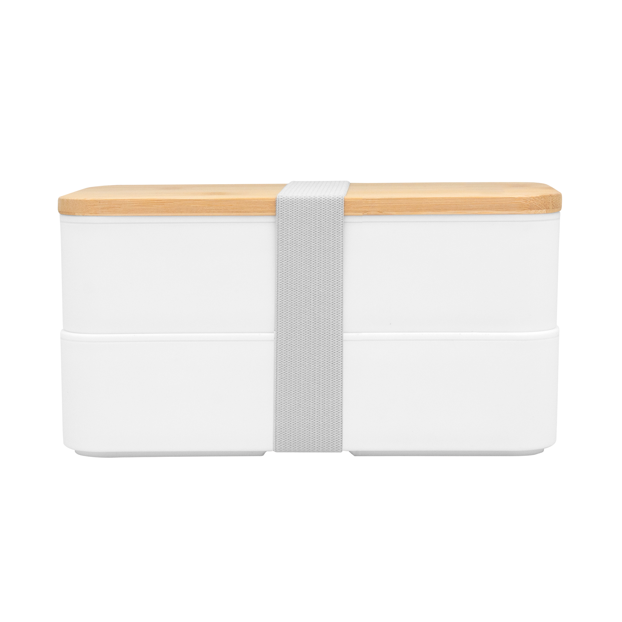 Organiza tus comidas de manera inteligente.Contenedor de alimentos con tapa de Bambú. Posee dos compartimentos plásticos, un separador y bandeja porta set de 3 cubiertos (cuchillo, tenedor, cuchara). La tapa de bambú debe presionar firmemente la bandeja donde se fija el juego de cubiertos. Cierre con sujeción elástica color gris. Producto apto para microondas (sin la tapa). Importante: solo se puede calentar la comida, NO sirve para cocinarla.Medidas: 18.5 x 10.5 x 9.7 cm.