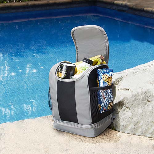 | 🏷️Descripción del producto | Interior plastificado. Cuenta con compartimentos superior e inferior con cierre. Incluye bolsas laterales de red, asa con broche y correa ajustable. Capacidad para 5 latas. |