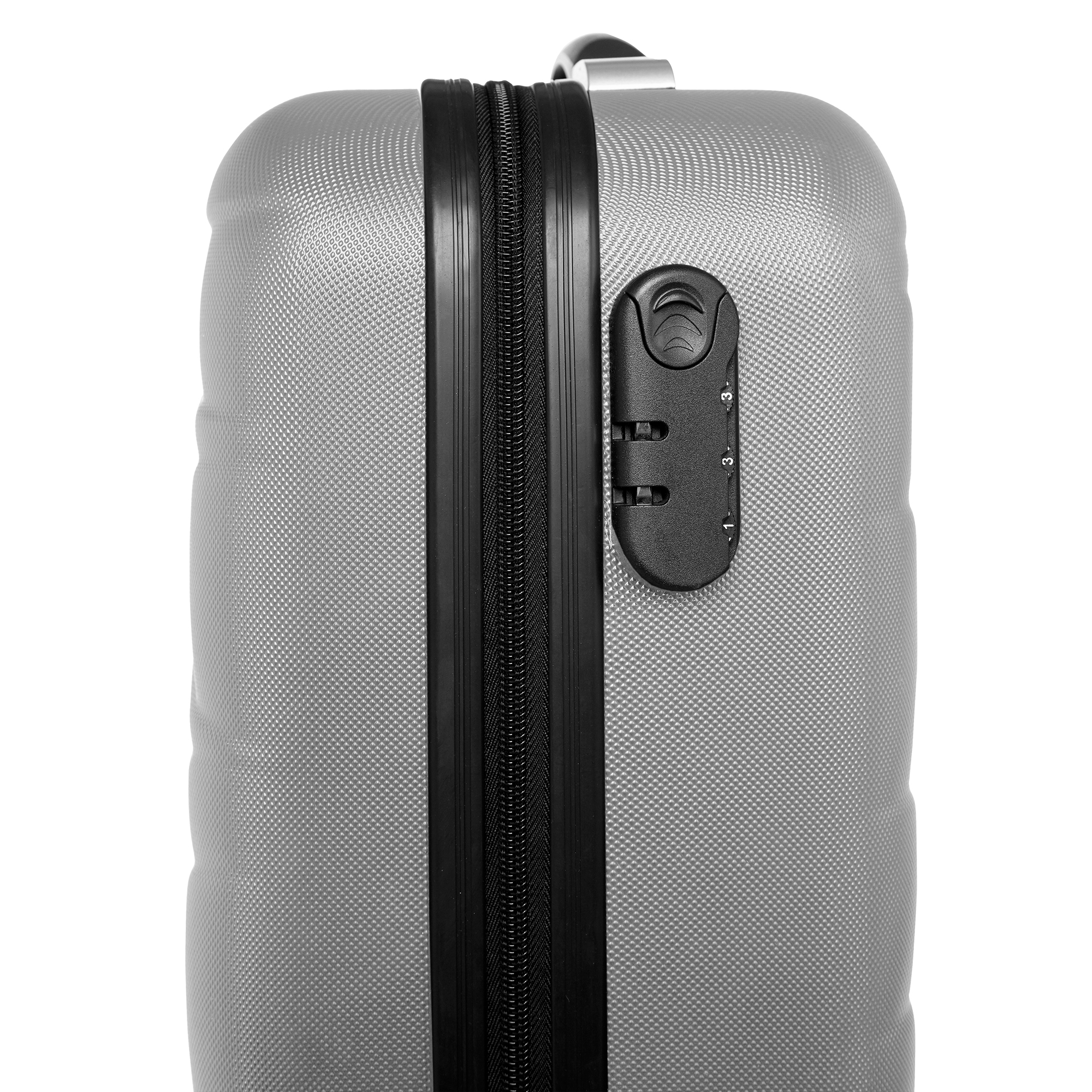 34 x 54 x 20 cm. (total). Capacidad 31 litros. ABS. Valija / Maleta pequeña. 4 ruedas con giro 360°. Manija de transporte reforzada. Mango extensible hasta 54 cm. 2 posiciones. Interior: 2 compartimentos principales con cierre y elásticos ajustables. Placa metálica desmontable para grabado (medida: 6 x 4 cm.) Candado incluido con combinación.