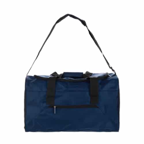 Maleta deportiva con un compartimento principal reforzado, asas sujetadoras con velcro, correa ajustable, un compartimento frontal y fuelle.