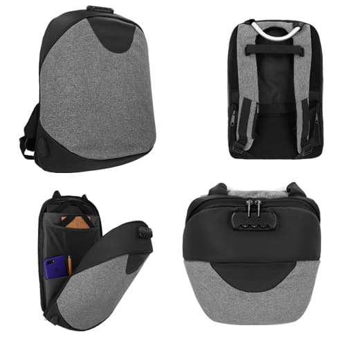 Mochila de poliéster con candado de seguridad, asa de aluminio, 1 compartimento para tarjetas, 2 compartimentos laterales, 2 cintillas adaptables para maleta, compartimento para laptop max. de 16 pulgadas, entrada interna con puerto de carga USB, organizador interno de 8 compartimentos respaldo y tirantes acojinados.