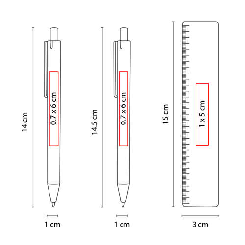 Medidas de Impresión: 0.7 x 6 cm Bolígrafo / 0.7 x 6 cm Lapicera / 1 x 5 cm Regla