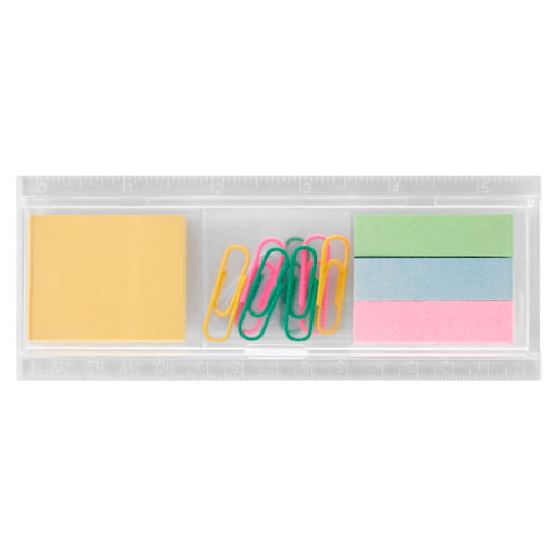 Set de regla de 13 cm con notas adheribles beige, 3 banderas de colores y clips.