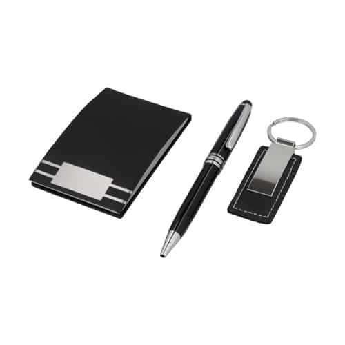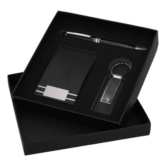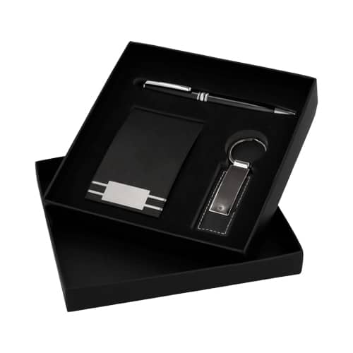 Set ejecutivo: Incluye llavero metálico y curpiel, tarjetero, bolígrafo metálico y estuche de regalo.