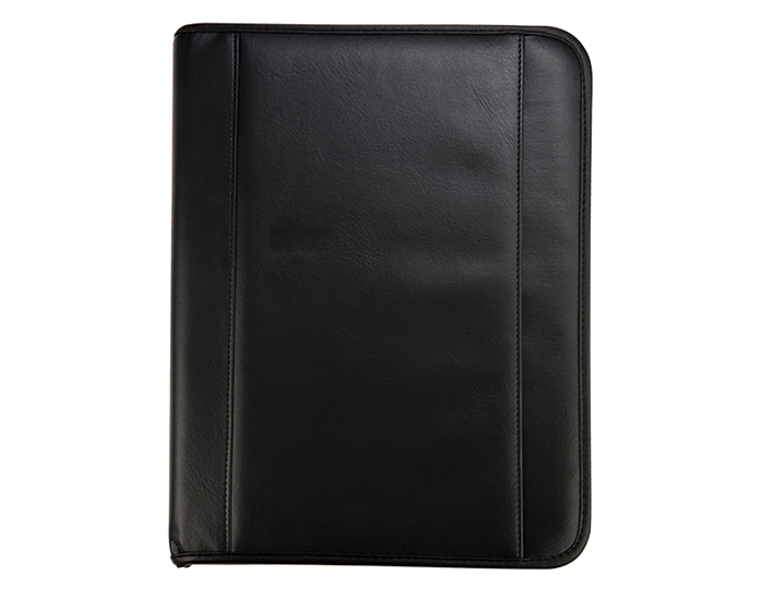 Carpeta ejecutiva con cierre, block de 29 hojas rayadas, notas y banderas adhesivas, porta documentos, divisiones para tarjetas, calculadora y cinta elástica para sujetar pluma.