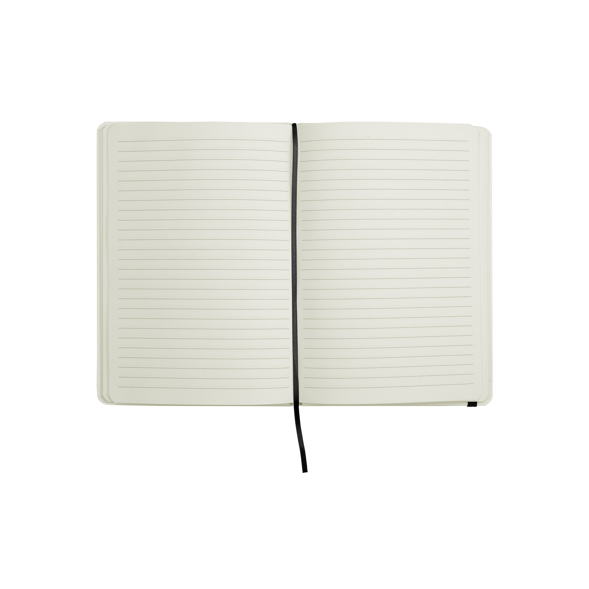 21 x 14,5 x 1 cm. Cartón. Libreta de pasta dura color blanco. Contiene 80 hojas rayadas, separador de tela. Cierra con banda elástica de color.