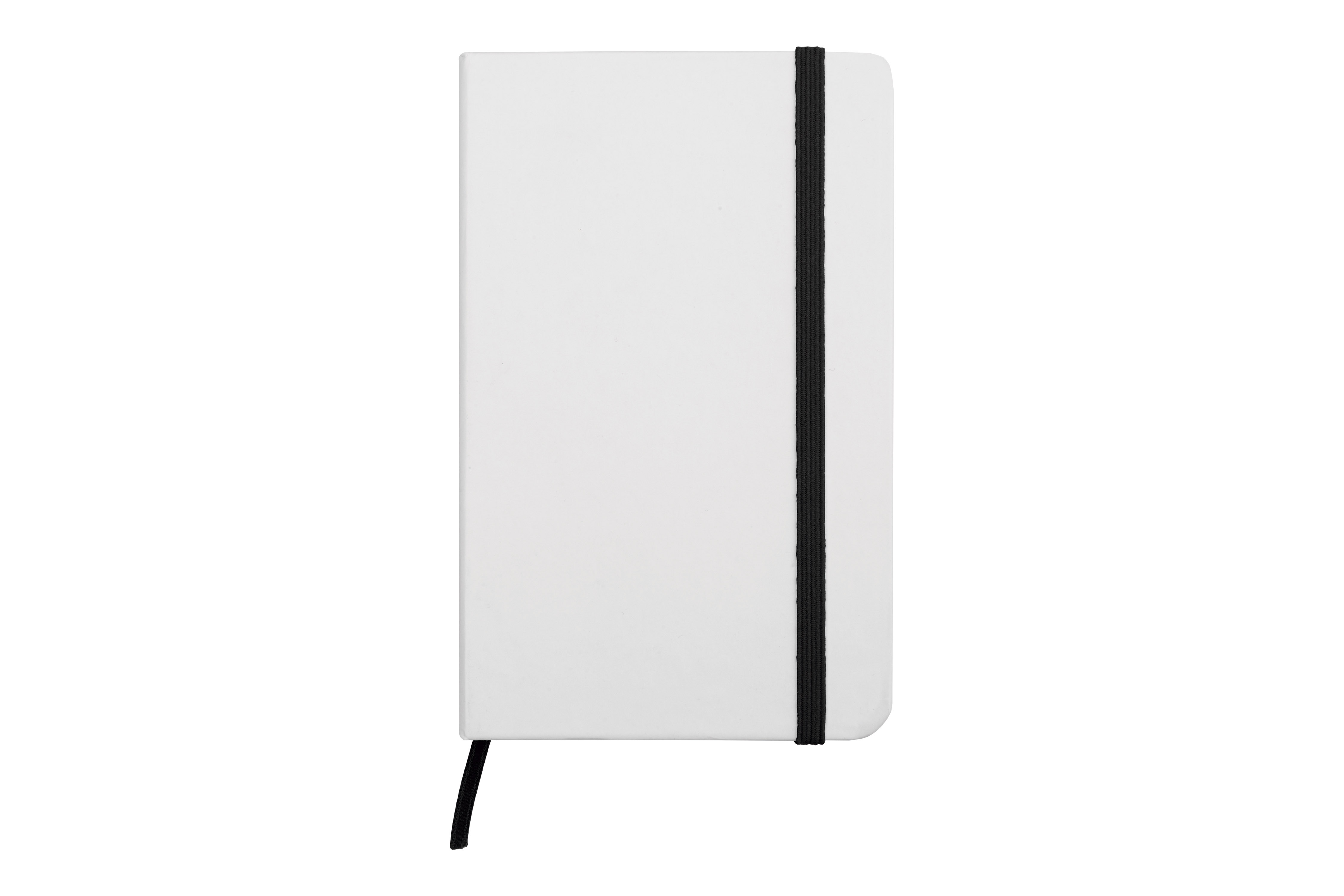 14,3 x 9,2 x 1,1 cm. Cartón. Libreta de pasta dura color blanco. Contiene 80 hojas rayadas, separador de tela. Cierra con banda elástica de color.
