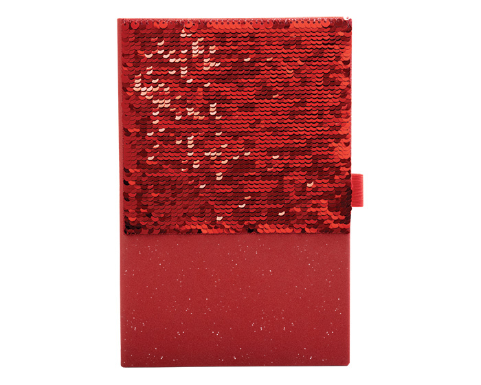 | 🏷️Descripción del producto | Libreta vertical A5 de pasta rígida con textura brillante y detalle de lentejuela reversible. Con 80 hojas rayadas (160 paginas). Separador de listón y porta bolígrafo elástico. |