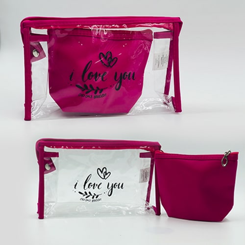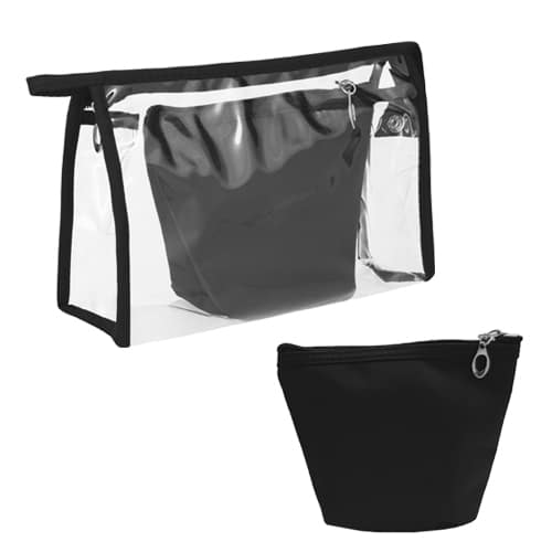 | 🏷️Descripción del producto | Cosmetiquera de plástico con cierre, asa y broche, que en el interior incluye mini cosmetiquera de poliéster con cierre. |