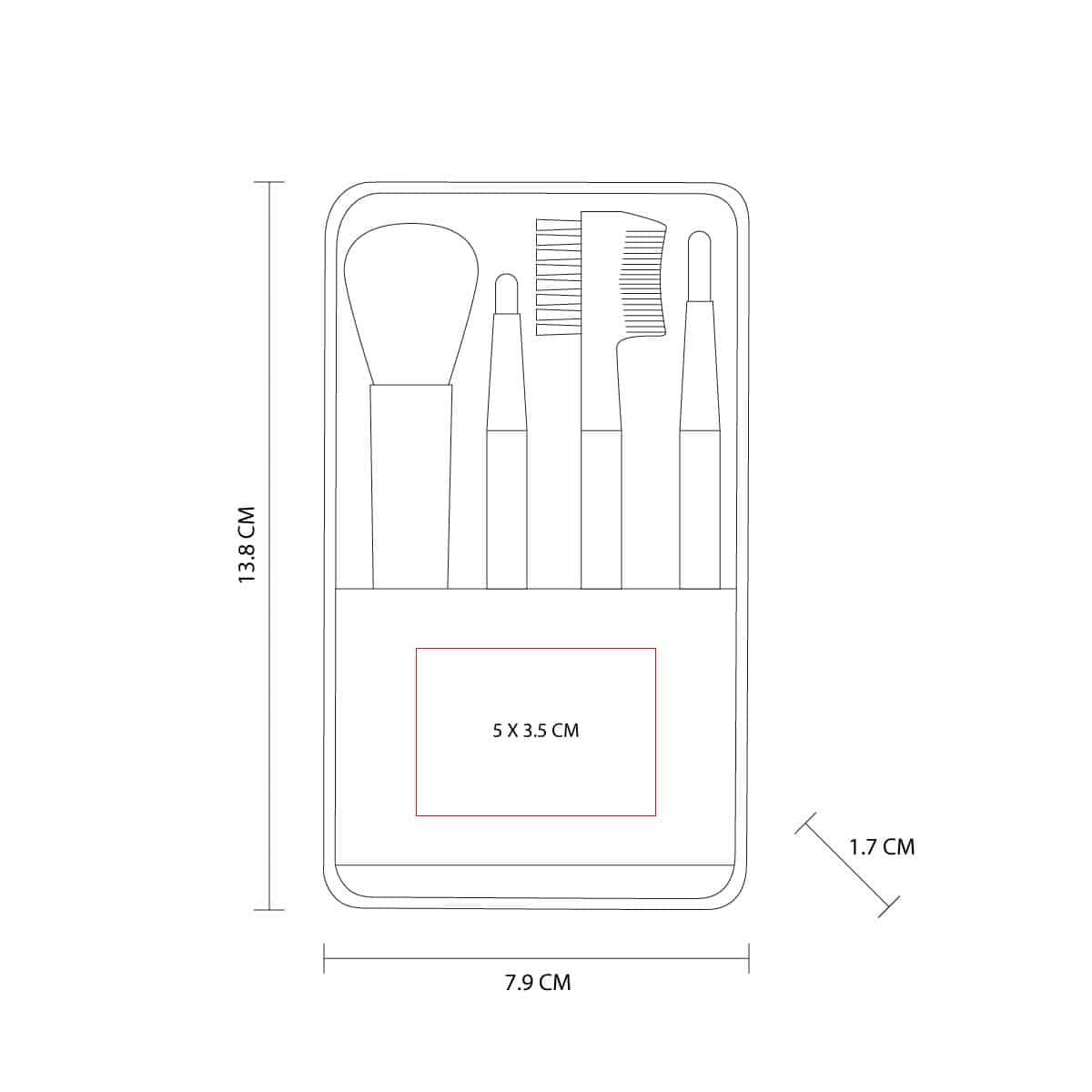 Estuche de plastico con 1 brocha para sombras, 1 brocha para labios, 1 brocha para rubor y 1 peine para cejas y pestanas.