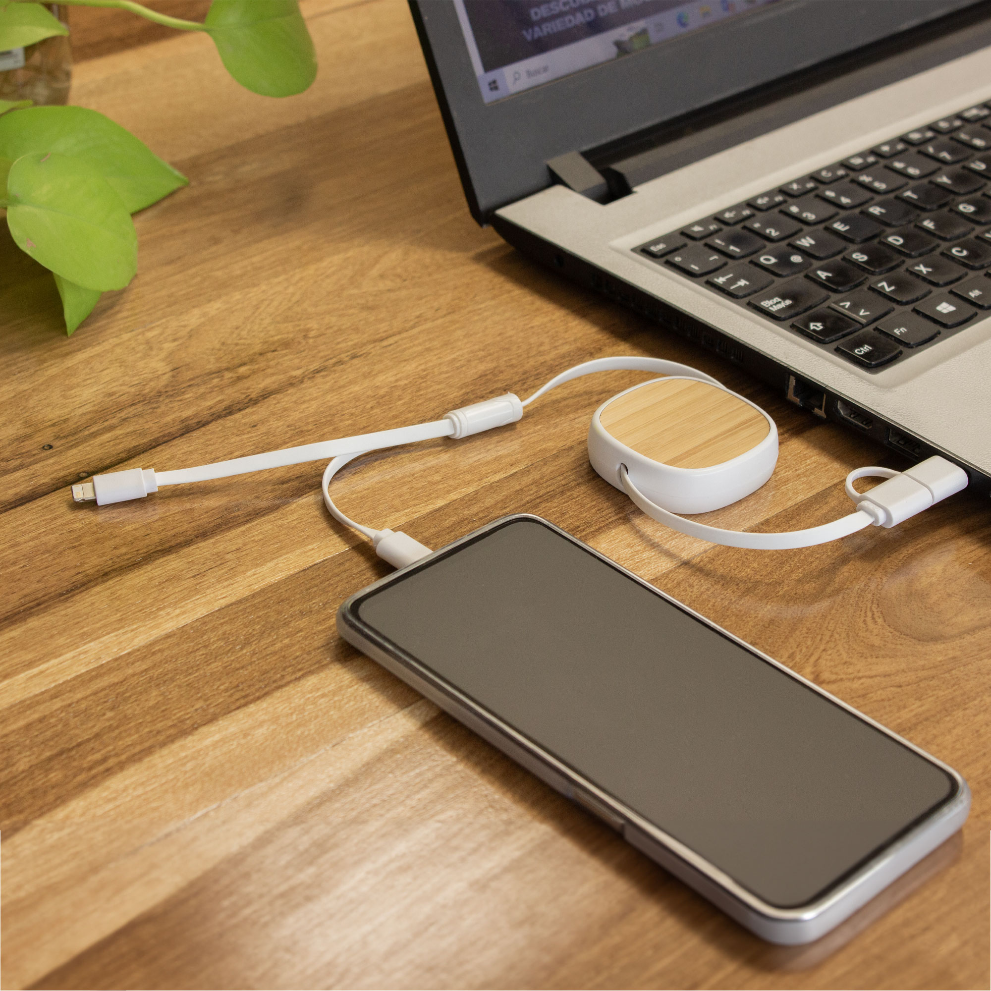 | 🏷️Descripción del producto | 5,3 x 1,5 x 22,5 cm. Bambú / ABS. Cable de carga retráctil con longitud de hasta 85 cm. Posee un conector Lightning, dos conectores USB-C y un conector USB standard. Presentación en caja de regalo kraft. |