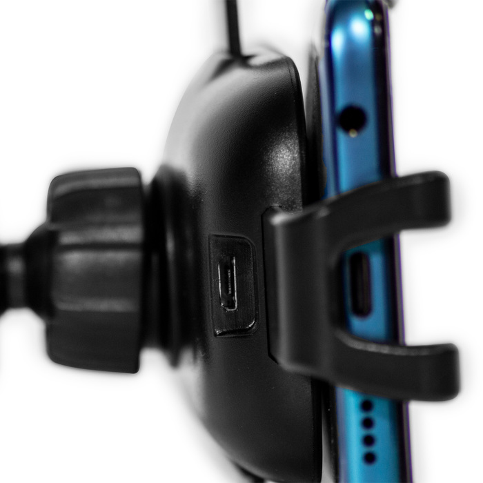 11,2 x 5,5 x 8,2 (largo). Plástico ABS. Holder para celular con botón en la parte trasera. Mediante una leve presión se engancha en la ventilación del aire acondicionado del auto. El celular se apoya sobre 3 brazos que se ajustan para obtener una buena sujeción. En el centro cuenta con un circulo y con el simple contacto del celular comienza a cargar de manera inalámbrica la bateria. En la parte inferior tiene una entrada mini USB que permite darle carga al holder. Voltaje de entrada: 15W. Voltaje de salida: 10 W. Viene con cable cargador./n/n/n![]()