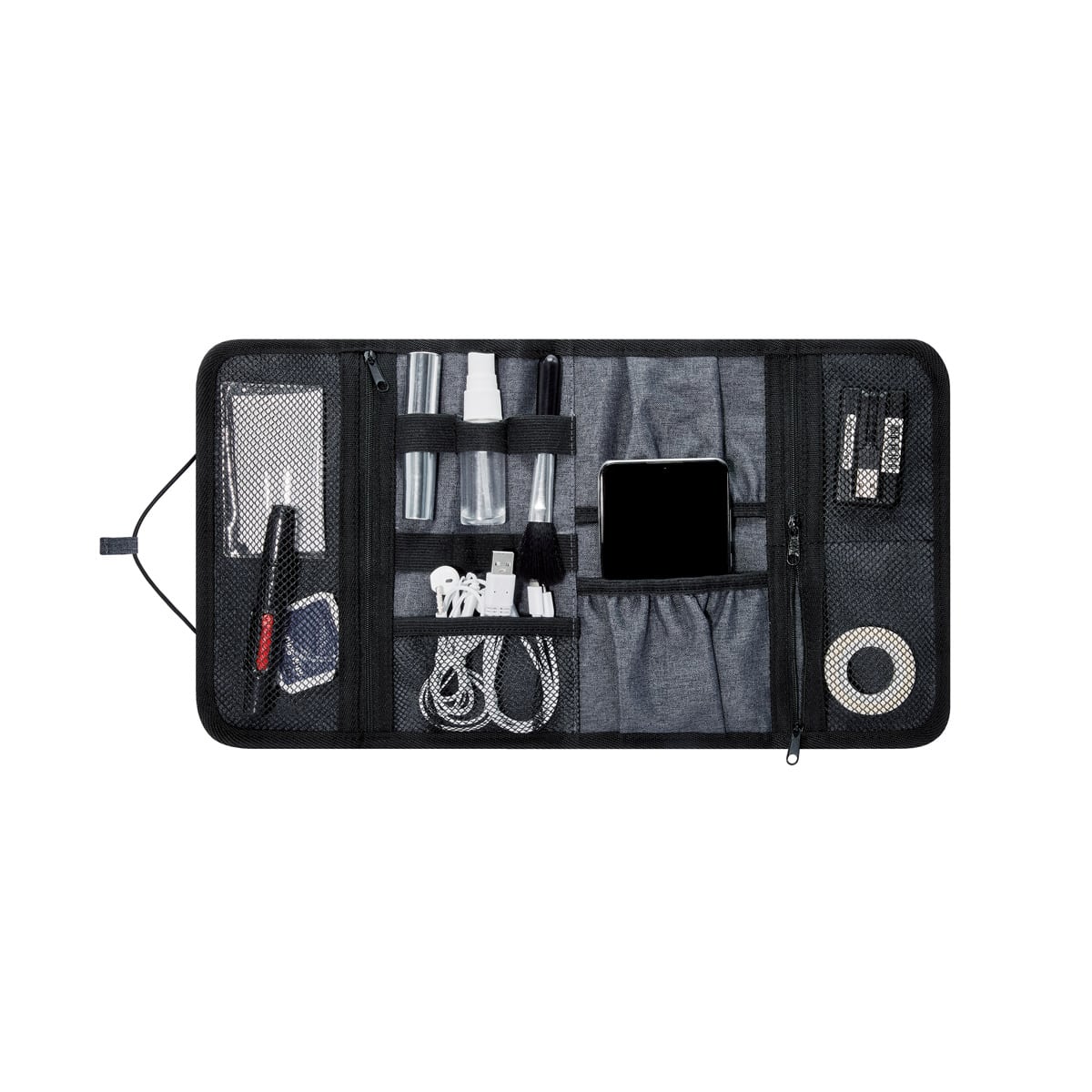 | 🏷️Descripción del producto | Organizador enrollable para accesorios. Contiene dos compartimentos con cierre y malla, un compartimento intermedio con bandas elasticas y un compartimento con dos bolsillos. Cierre con elastico. |