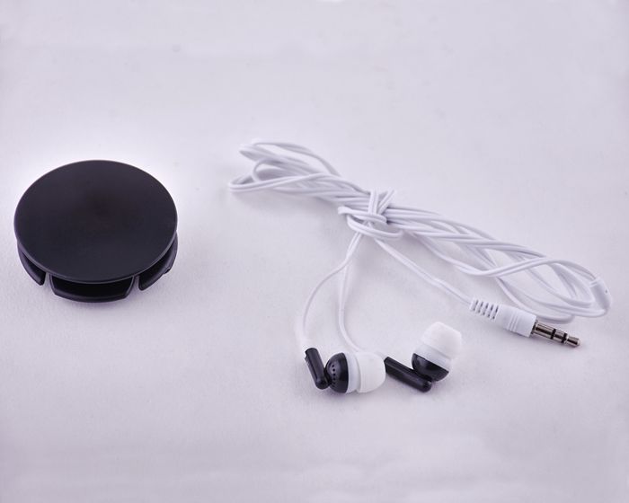 Audífonos personales con base circular diseñada para guardar los cables sin que se enreden. La base cuenta con clip para sostenerse en el cinturón o mochila. Para guardarse, se sujeta un extremo en la hendidura del reverso de la base y se enrollan los cables. Extensión total: 122 cm.