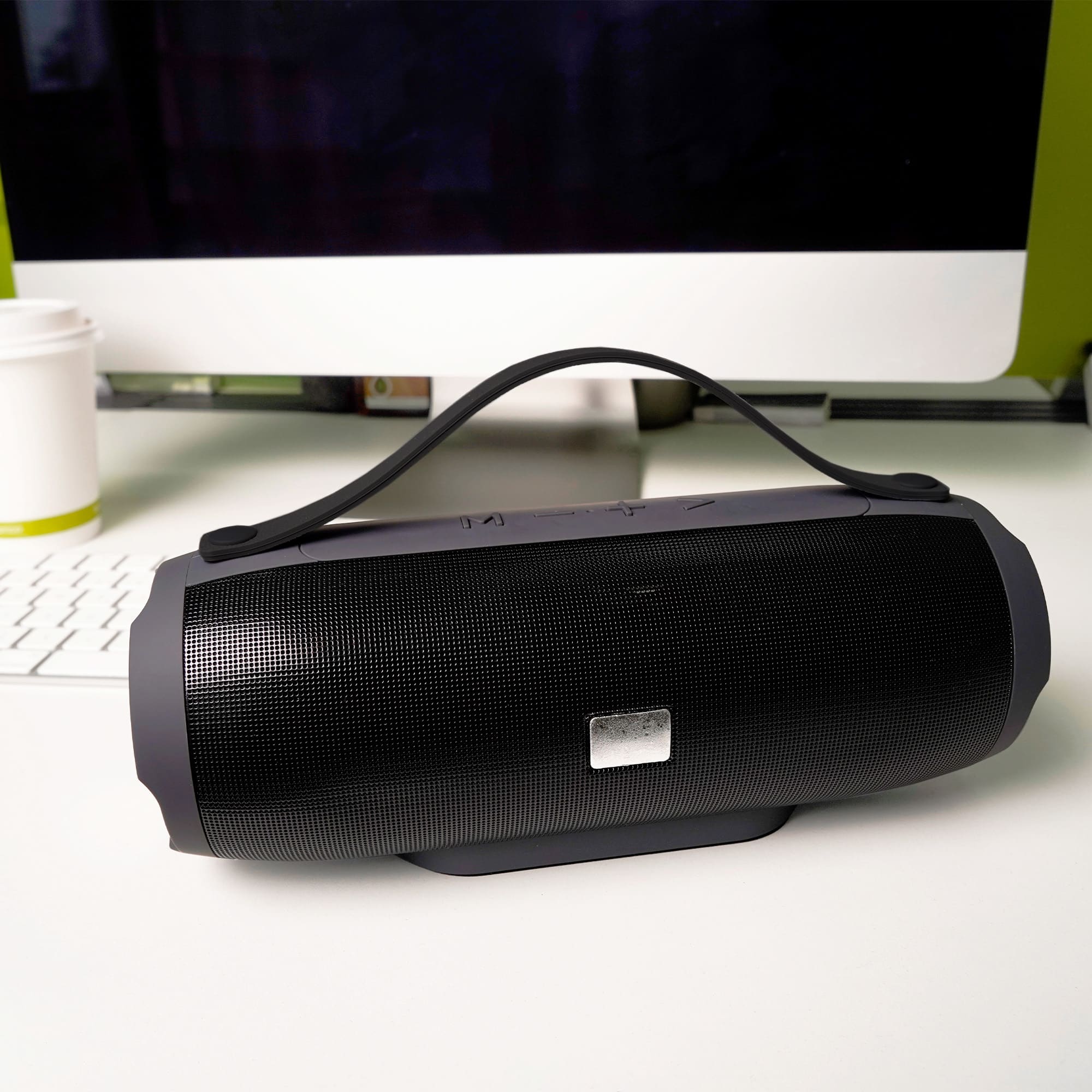 Bocina portátil bluetooth en acabado rubber con placa metálica, correa de silicón, radio FM, función de manos libres, control de volumen, botón de encendido y apagado, entrada micro USB, entrada micro SD, entrada USB y entrada AUX. Batería recargable con duración de 2-3 horas.