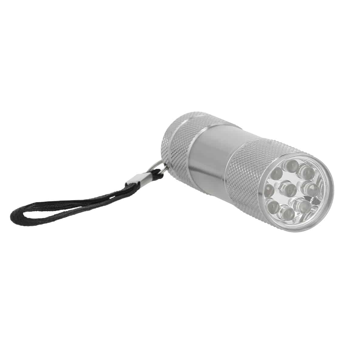 Lámpara metálica con 9 LEDS de luz blanca, con botón de encendido y apagado. Incluye correa de mano. Utiliza 3 baterías AAA ( no incluidas).