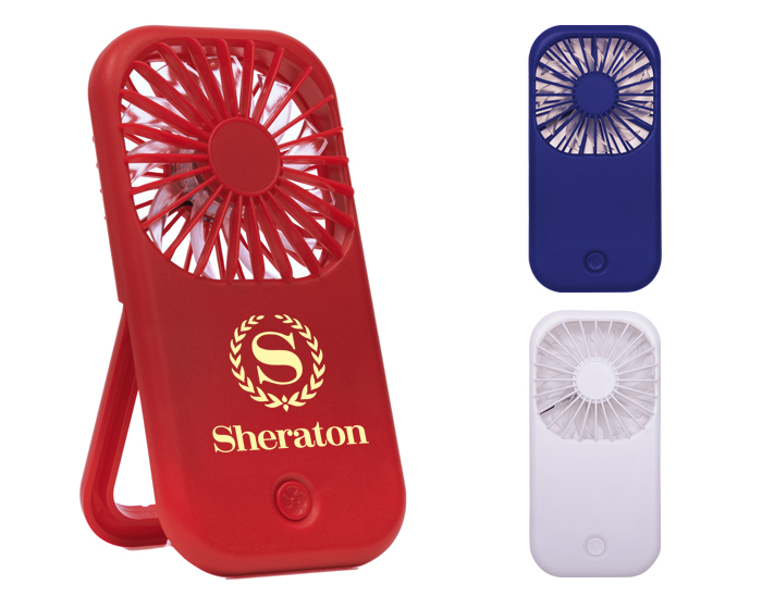 Mini ventilador portátil con dos velocidades y soporte abatible. Requiere 3 Baterías AAA (incluidas).